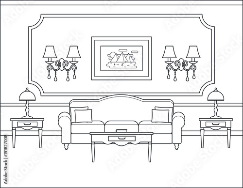 Detailed Black Line Drawing Of A Custom Living Room Stock Photo